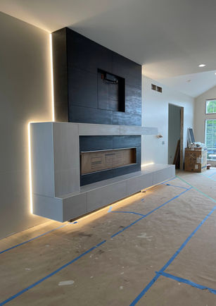 This custom fireplace was designed and constructed by our team, featuring a modern, minimalist aesthetic with a striking blend of concrete and dark panels. Integrated LED lighting adds a warm ambient glow, highlighting the unique geometric design and floating base. This installation serves as both a functional heating element and a statement piece.
